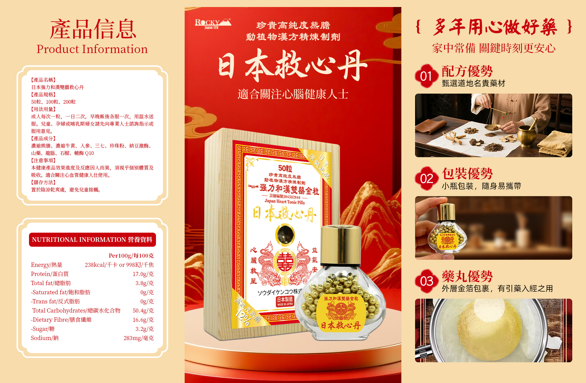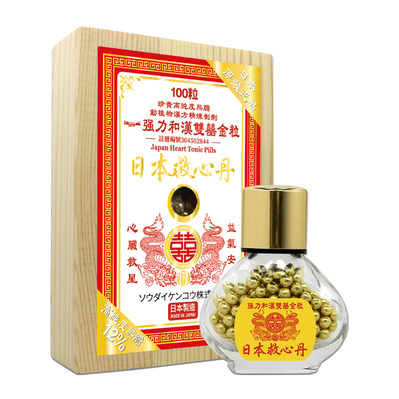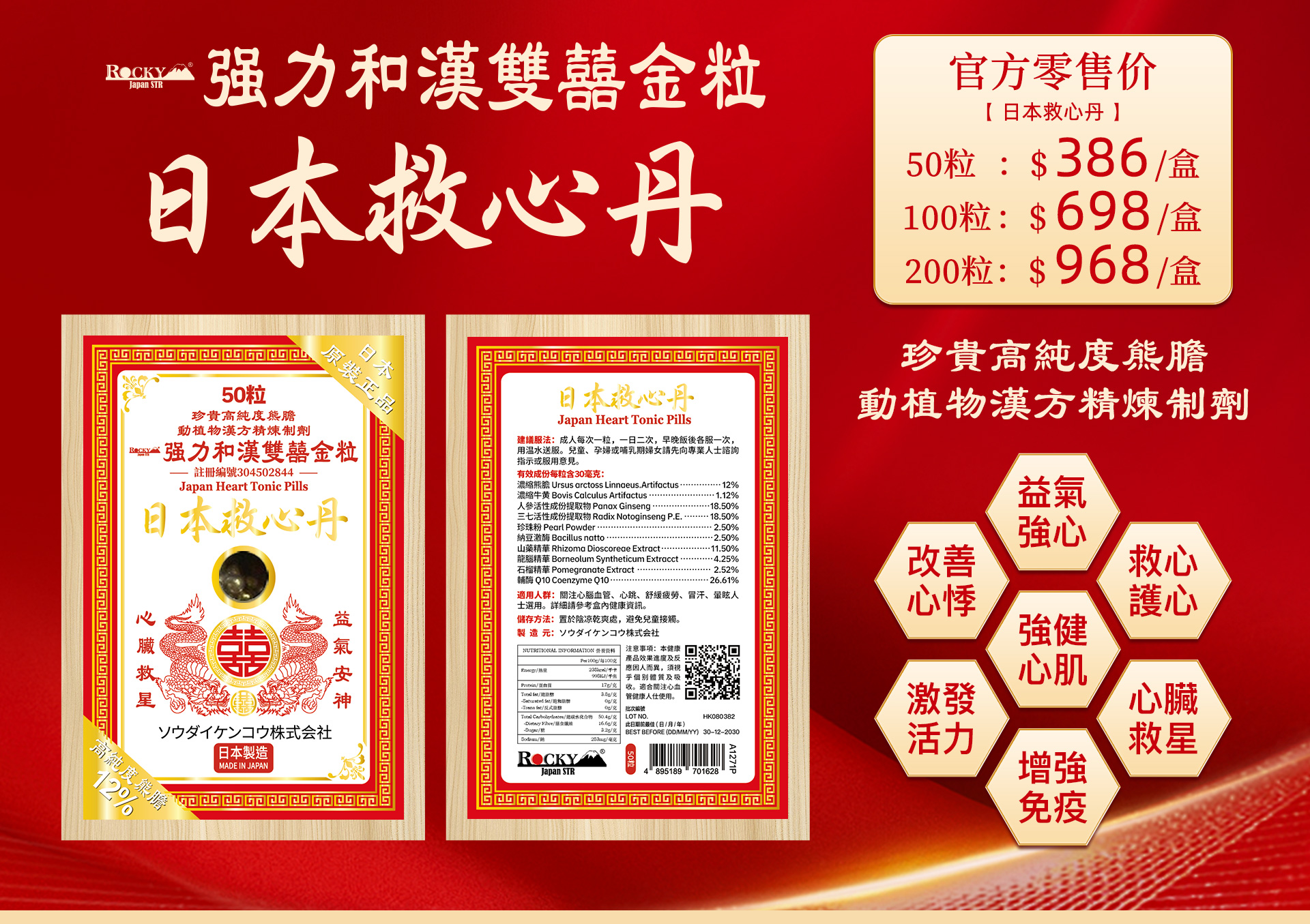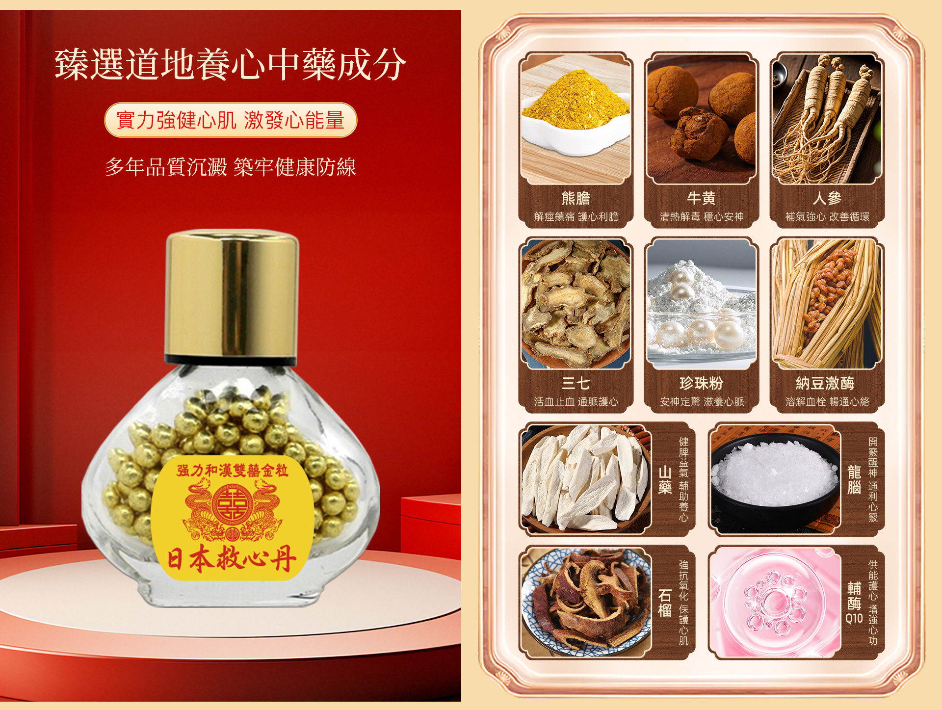 日本強力和漢雙囍救心丹:能夠舒緩冠脈流量減少、心肌耗氧量上升所帶來的心臟負擔,同時舒緩冠狀動脈側枝環的壓力,改善心臟血液循環,減輕心悸丶呼吸急促等引起的不適,或有助於調節自主神經系統,促進全身血液循環。此外,它也具有抗體和強心的作用。特別適合於關注冠心病、心絞痛、心肌缺血等情況的人士,連續服用三至四個月後,用家獲得了顯著的健康改善。